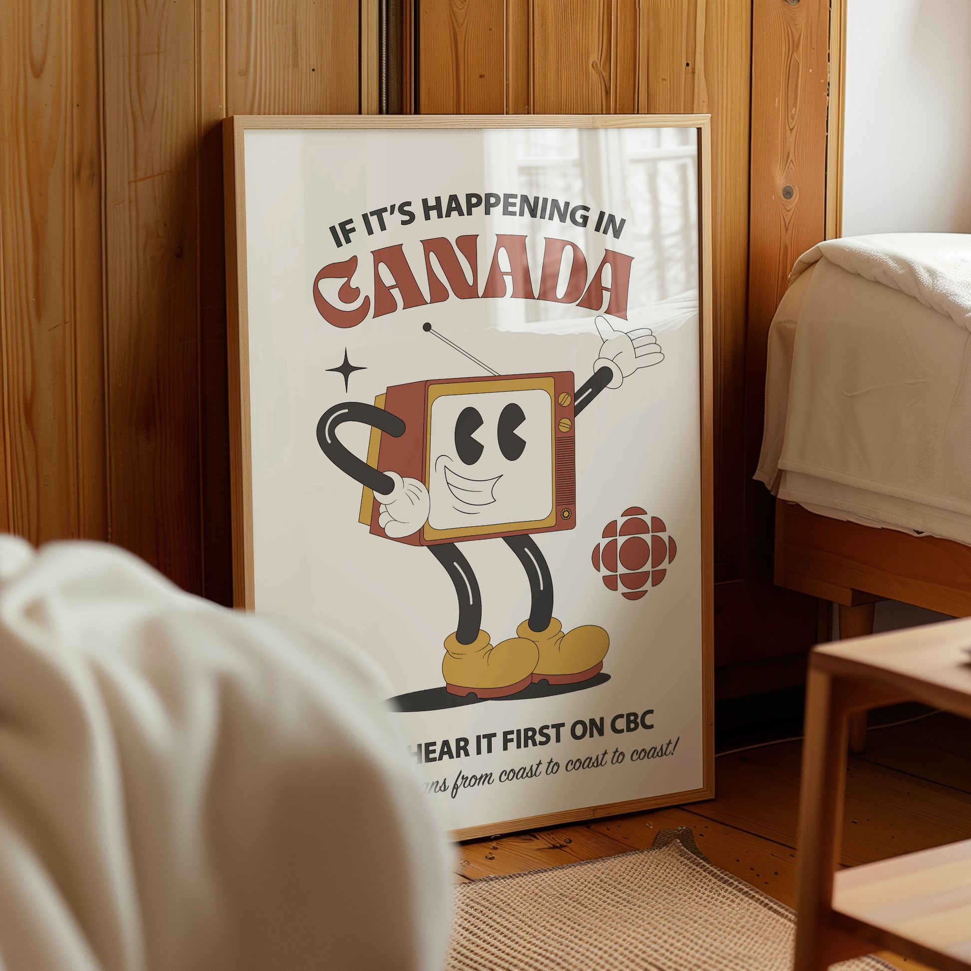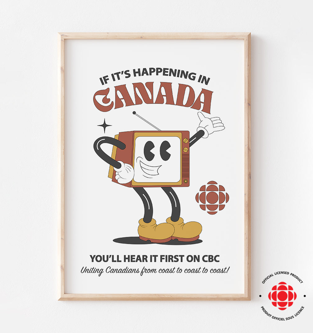 Meet our officially licensed CBC x Poppermost print - featuring a classic rubber hose TV character with a patriotic punchline - "If it's happening in Canada, you'll hear it first on CBC." This vintage-inspired piece celebrates classic broadcasting charm with a wink!